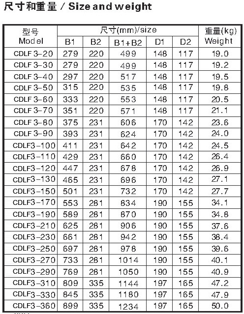 CDLF為安裝標準電機的非自吸立式多級離心泵,電機軸通過泵頭用聯(lián)軸器直接與泵軸聯(lián)接,拉桿螺栓將耐壓筒、過流部件固定在泵頭和進出水段之間,泵進出水口在泵底同一直線上;本泵可根據(jù)需要配置智能保護器,對泵干轉(zhuǎn)\缺相\過載等進行有效保護。