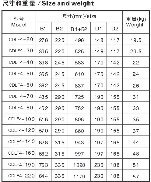 CDLF為安裝標準電機的非自吸立式多級離心泵,電機軸通過泵頭用聯軸器直接與泵軸聯接,拉桿螺栓將耐壓筒、過流部件固定在泵頭和進出水段之間,泵進出水口在泵底同一直線上;本泵可根據需要配置智能保護器,對泵干轉\缺相\過載等進行有效保護。